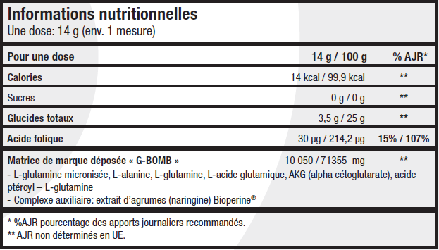 L-glutamine، maltodextrin، acidity corrector (حامض الستريك اللامائي) ، المحليات (acesulfame K ، السكرالوز) ، النكهات ، تلوين (أملاح الكراميل) ، عامل مضاد للتخثر (ثلاثي فوسفات الكالسيوم) ، النارينجين المستخرج من ثمار الحمضيات paradisi (مقتطف 25: 1) ، الكيتو ألفا كيتوجلوتارات ، 1 ألانين ، L-glutamic acid ، ميكروتيزيد l-glutamine ، Bioperine® (مستخلص فاكهة من piper nigrum 50: 1) ، pteroylmonoglutamic acid