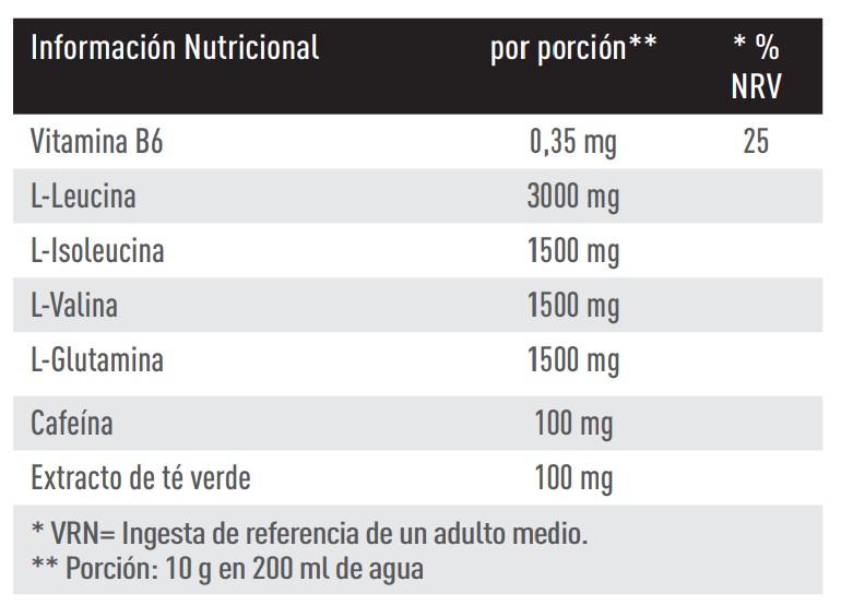 (شاي مثلج بالليمون): 30٪ L-leucine، 15٪ L-isoleucine، 15٪ L-valine، 15٪ L-glutamine، acidulants: citric acid، tartaric acid؛ رائحة ، مالتوديكسترين ، العسل ، مستخلص الشاي الأخضر (كاميليا سينينسيس إل.) ، الكافيين الطبيعي ، المحليات: اسيسولفام ك ، سوكرالوسي ، ستيفي جليكوسيدات. تلطيخ: E150c ؛ وكيل مكافحة التكتل: ثاني أكسيد السيليكون. مستحلب: فول الصويا ليتيسين. مثخن: صمغ الزانثان. فيتامين B6 (البيريدوكسين هيدروكلوريد). قد تحتوي على آثار الحليب واللاكتوز والغلوتين والبيض.