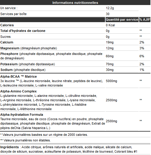 ألفا أمينو هو صيغة قوية من الأحماض الأمينية التي توفر أيضا مصفوفة تعزيز الترطيب الخلوي والتبادلات بين السوائل في العضلات وبالتالي تعزيز قدرتها على التعاقد أكثر كثافة ولأطول.
