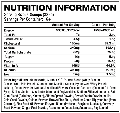 Maltodextrin ، Combat XL مزيج البروتين (مركز بروتين مصل اللبن ، مركزات بروتين الحليب ، الكازين micellar ، بروتين مصل اللبن المعزول المعزول) ، مسحوق الكاكاو ، النكهات الطبيعية والاصطناعية ، مقشدة جوز الهند (زيت جوز الهند ، شراب الذرة الصلبة ، الصوديوم ، أحادي و diglycerides ، سيليكو الصوديوم ألومينات) ، الملح ، مزيج اللثة (السليلوز ، الزانثان) ، مسحوق البرسيم ، مسحوق البطاطا الحلوة ، الأنسولين ، مسحوق بذور الشيا ، مسحوق الكينوا ، طحين الأرز البني ، الجلسريدات الثلاثية السلسلة المتوسطة (من جوز الهند) ، مسحوق زيت بذور الكتان ، مزيج الإنزيم البروتيز الأميليز ، اللاكتاز) ، مسحوق الفواكه كاراواي ، مسحوق جذر الزنجبيل ، اسيسولفام البوتاسيوم ، السكرالوز ، الليسيثين الصويا.
