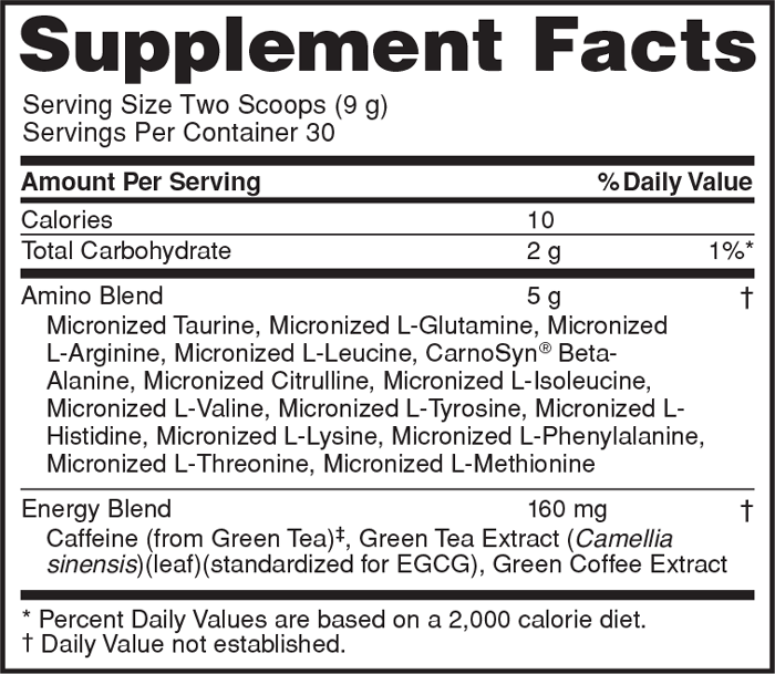 Avec seulement 10 calories par service, Essential Amino Energy vous fera forte impression sans déséquilibrer votre régime. Mélangez et prenez Essential Amino Energy seul - ou avec votre supplément en poudre habituel - à chaque fois que vous chercherez à gagner en concentration mentale, physique ou en énergie, à produire plus d'oxyde nitrique (NO) et pour soutenir la recuperation musculaire.