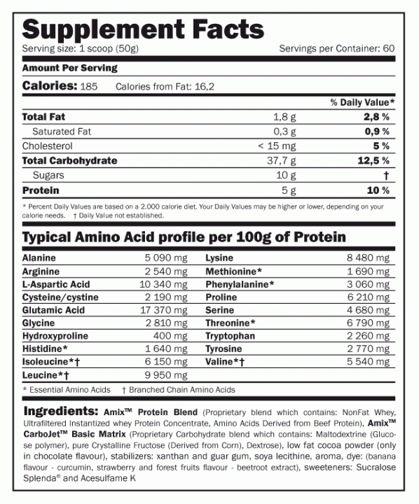 Mélange de protéines (mélange exclusif qui contient: Nonfat de lactosérum, Ultrafilter Instantané de lactosérum concentré de protéines, acides aminés dérivés des protéines de boeuf), Amix ™ CARBOJET ™ Basic Matrix (propriétaire Glucides mélange qui contient: maltodextrine (polymère du glucose) Crystalline pur fructose / dérivés de maïs /, dextrose), poudre de cacao maigre (seulement dans la saveur de chocolat), des stabilisants: gomme de xanthane et de guar, de la lécithine de soja, arôme et colorant (arôme de banane - la curcumine, la fraise et la saveur des fruits des bois - extrait de betterave) , édulcorants: Sucralose Splenda® et Acesulfame K.