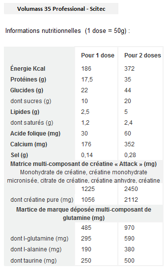 Cinq sources de créatine, du concentré de whey, de la taurine, une source de glucides ultra assimilables ; le tout dans un mélange contenant pas moins de 700 calories par dose ! Volumass 35 Professionnal® se situe parmi les références les plus prisées des lean gainers enrichis. Une valeur sûre !