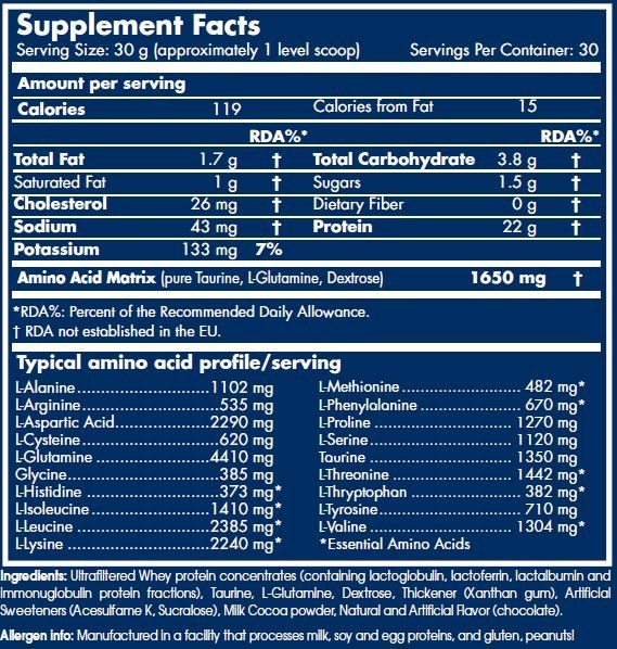 Concentré de protéines de whey (de lait, émulsifiant: lécithine de soja), cacao maigre en poudre (10-12%), taurine, dextrose, L-Glutamine, chlorure de sodium, arôme (chocolat), épaississant (gomme de xanthane), édulcorants (acésulfame-K, sucralose).