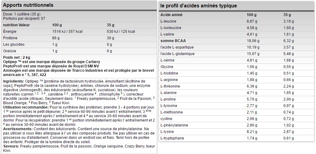 Optipep ™ [protéine de lactosérum hydrolysée, émulsifiant (lécithine de soja)], PeptoPro® (de la caséine hydrolysée), arômes, chlorure de sodium, une enzyme digestive (Aminogen®), des édulcorants (acésulfame K, sucralose), les couleurs naturelles (carmin 1,2 , 3,4 , carotène 2,3 , anthocyanine 4 , chlorophylle 5 ), correcteur d'acidité (acide citrique). Seulement dans: 1 Freaky pamplemousse, 2 Fruit de la Passion, 3Blood Orange, 4 Fou Berry, 5 Tueur Kiwi.